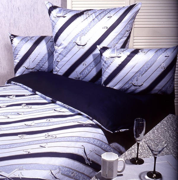 Aparte Schrägstreifen in klassischen Blautönen bilden die Grundlage für die hübschen nautischen Motive in Seidenmal-Optik.