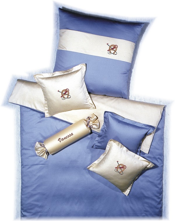 Bestehend aus Bettbezug 135x200 und Kissenbezug 80x80 incl. Stickerei "Hufeisen/Peitsche" auf großem Kissen ( ohne Zierkissen und Nackenrolle )