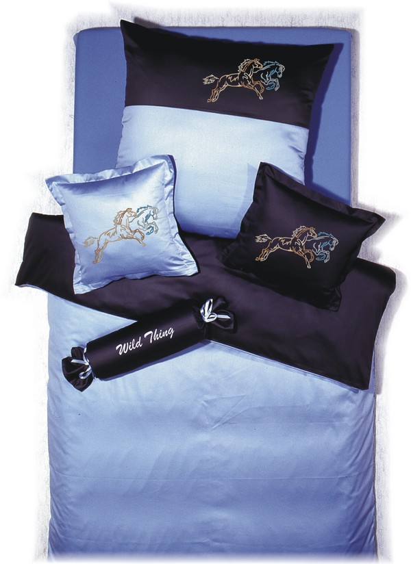 Bestehend aus Bettbezug 135x200 und Kissenbezug 80x80 im Originalstoff incl. Stickerei "Springende Pferde" auf großem Kissen( ohne Zierkissen und Nackenrolle ) Exquisite Pferde-Bettwäsche in elegantem Mako-Satin