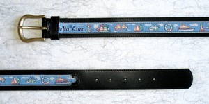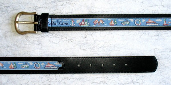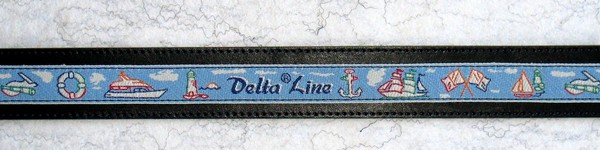 Aufgenähtes textiles Band mittelblau mit maritimen Outline-Motiven, an den Enden optisch ansprechend in gerundeten Ledereinfassungen.