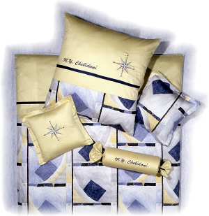 Ruhe und heitere,südliche Lebensart strahlt dieses lichte, in silbergrauen und blauen Marmorschattierungen gehaltene, cubische Dessin aus. Die "Yachting Special"-Ausführung mit der aparten einfarbigen Blende und dem kontrastfarbenen Satinband ermöglicht eine ganz persönliche Gestaltung durch das Einsticken eines maritimen Stickmotivs bzw.des Bootsnamens.
