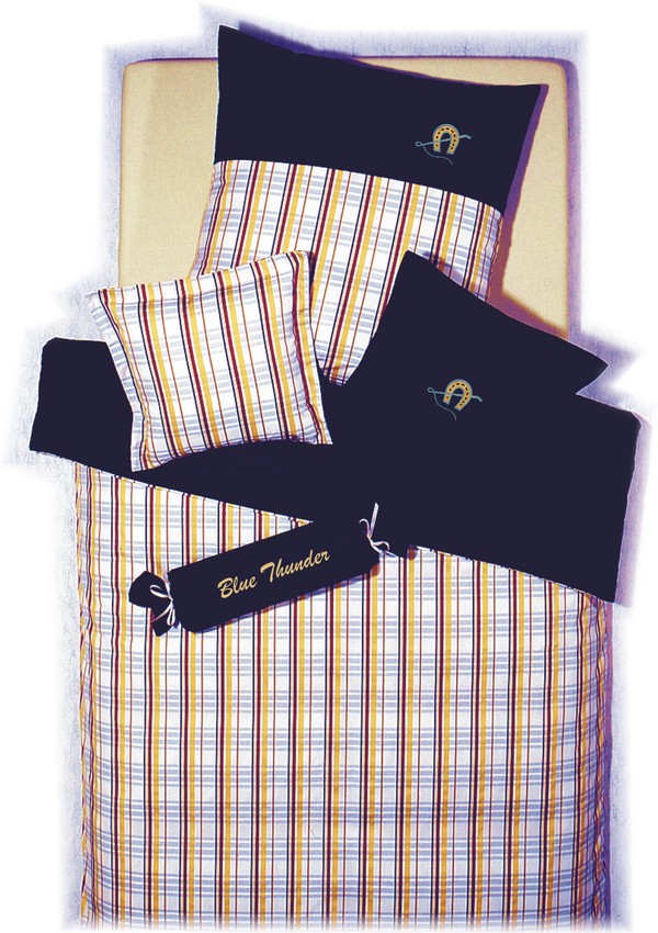 Bestehend aus Bettbezug 135x200 und Kissenbezug 80x80 sowie Stickerei "Peitsche/Hufeisen" auf großem Kissen ( ohne Zierkissen und Nackenrolle)